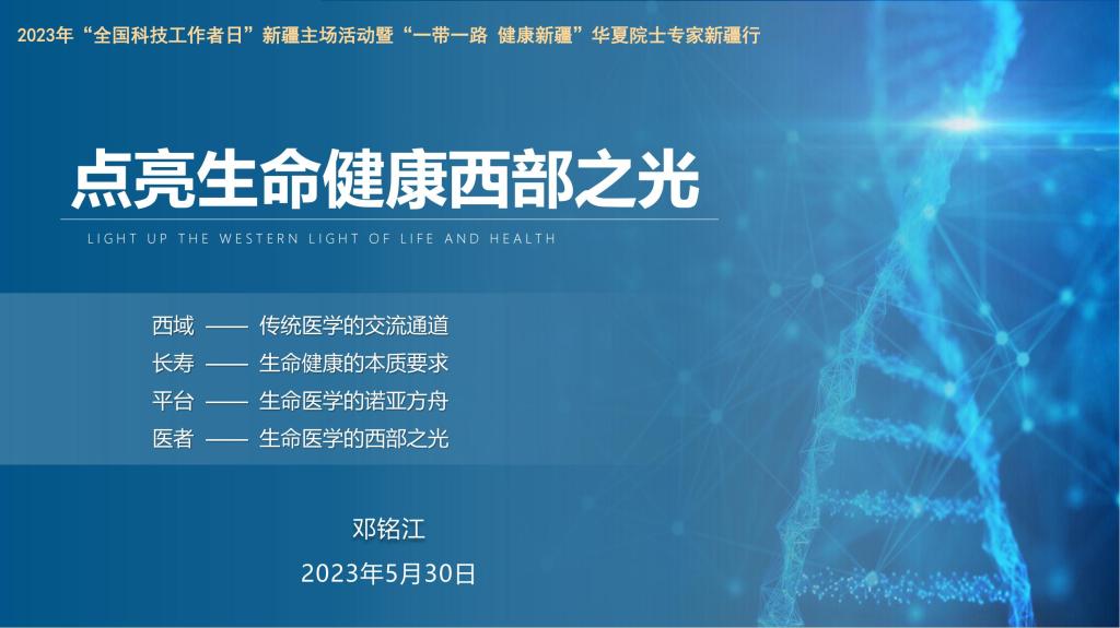 今天,在“5.30”這個科技工作者自己的節日里,我們迎來了“華夏院士行”的各位尊貴客人蒞臨新疆,在此我謹代表新疆科協及全疆科技工作者,為本次活動及論壇致辭,如果要給這篇致辭加個名字的話,就叫點亮生命健康西部之光。