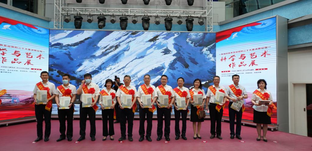 在今天的主場活動上,由自治區科協、自治區文聯、兵團科協和兵團文聯聯合舉辦的“喜迎二十大、奮進新征程”科學與藝術作品展同時開展,共展出了150余幅以科學與藝術為主題的書畫作品。參展作品以不同的藝術形式,從不同維度謳歌了建黨百年來我國科技事業取得的輝煌成就和時代風貌。開展儀式上,自治區8位書畫界名家現場揮毫,為“新疆最美科技工作者”贈送字畫,勉勵他們潛心研究、勇于創新,努力為創新型新疆建設再立新功。