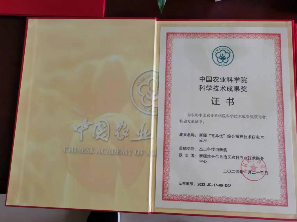 2024年4月,中國農科院發布信息,新疆農村專業技術服務中心申報的《新疆“寬早優”綜合植棉技術研究與應用》課題,獲得中國農業科學院“杰出科技創新獎”。同時,新疆科協王光強和中棉所張西嶺、宋美珍主持的《新疆“寬早優”植棉》專著,榮獲中國農業科學技術出版社“第二屆農業科技圖書獎優秀獎”。