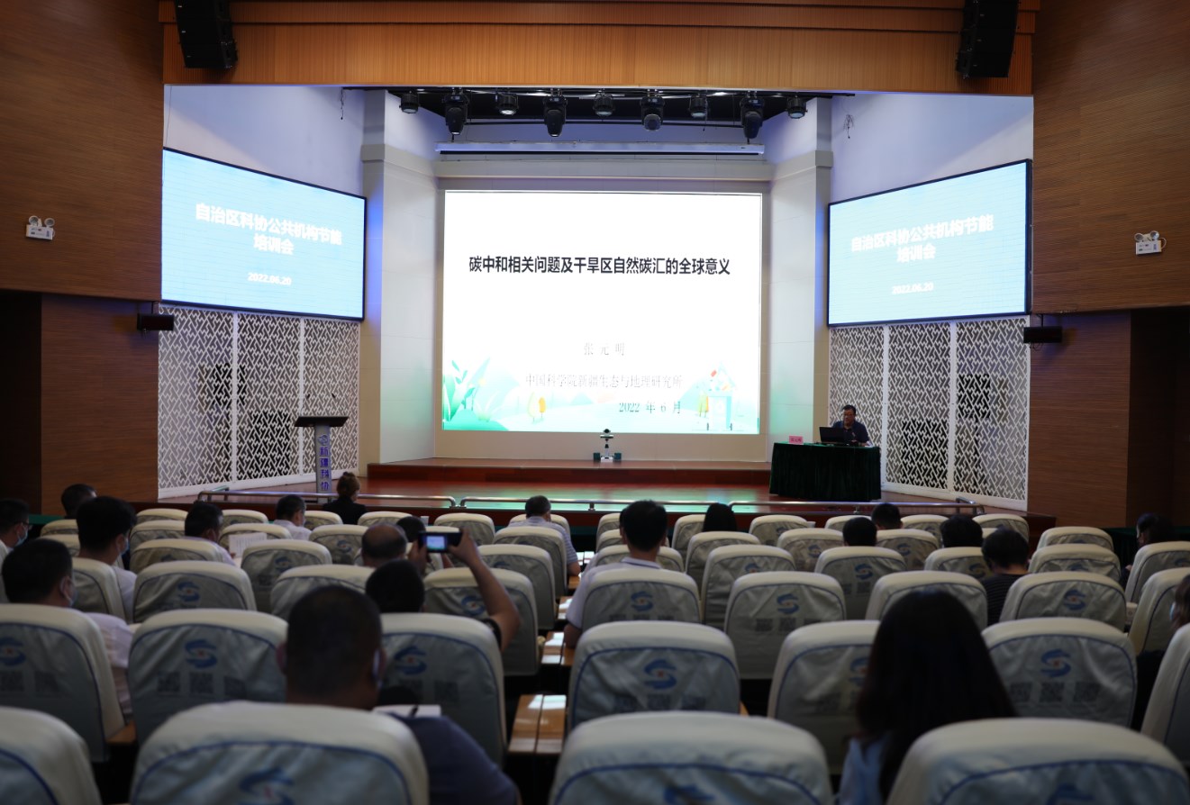 中科院新疆生態與地理研究所所長、自治區生態學學科帶頭人張元明博士作了《干旱區碳匯特征及其全球意義》的專題學術報告。張元明全方位介紹了“氣候變暖與溫室效應”給全球生態帶來的巨大影響和諸多不可預知的原因,系統解讀了習近平生態文明思想的指導意義、科學內涵和重要價值,凝練概述了“碳達峰碳中和”的基礎信息、國際背景、國家戰略、實現路徑、前沿技術布局和遠景目標,重點介紹了新疆科研工作者們經過數年探索,勇闖干旱地帶碳匯研究“無人區”的生動實踐,深刻揭示了大漠戈壁地下無機碳匯形成的科學機理,精辟闡釋了此項重大科學發現的戰略意義和重要價值,并提出了未來研究方向和推進思路。
