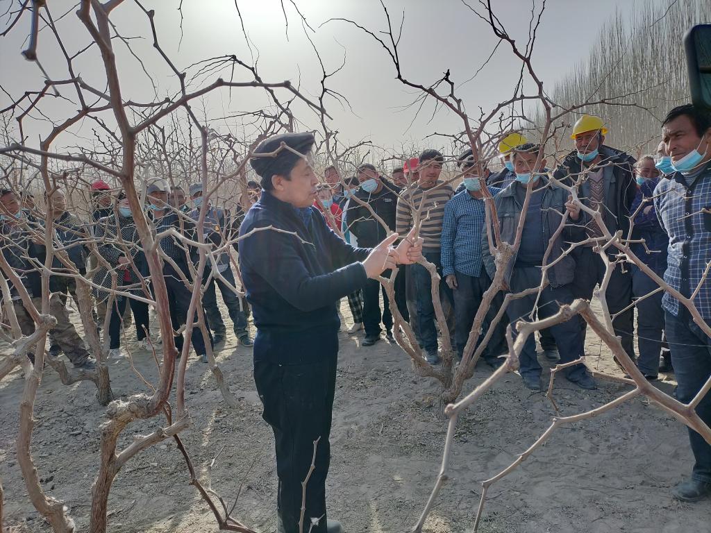 在紅棗種植與管理培訓(xùn)活動(dòng)現(xiàn)場(chǎng),來(lái)自新疆農(nóng)科院園藝所的林果種植專家克里木·伊明教授,直接把培訓(xùn)活動(dòng)的現(xiàn)場(chǎng)設(shè)在了紅棗地,在田間地頭給果農(nóng)“傳道授業(yè)解惑”。村民奧斯曼邊認(rèn)真聽(tīng)講邊拿手機(jī)錄,“感謝教授這么遠(yuǎn)過(guò)來(lái)給我們講課,教授講得太好了,我要錄下來(lái)好好學(xué)習(xí)。”