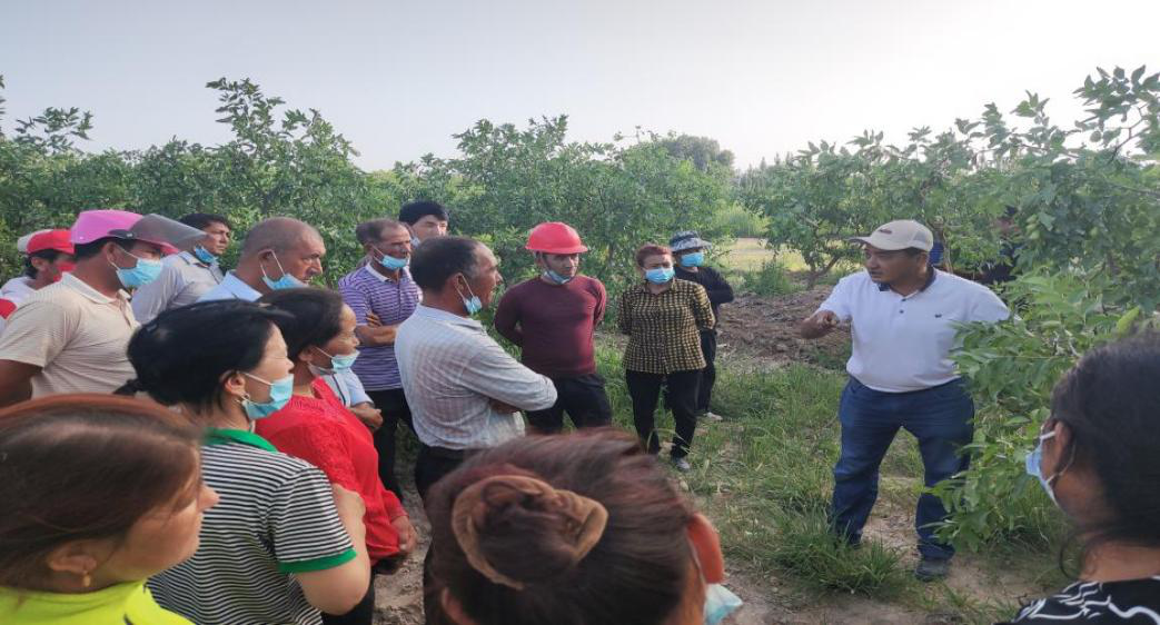 培訓(xùn)中,玉蘇甫·阿不力提甫副教授深入紅棗地,現(xiàn)場為棗農(nóng)指導(dǎo)講解了有關(guān)紅棗樹形修剪、病蟲害防治、提高坐果率、追肥、棗頭和棗吊處理、水分要求及成熟期采收要求等方面的知識。
