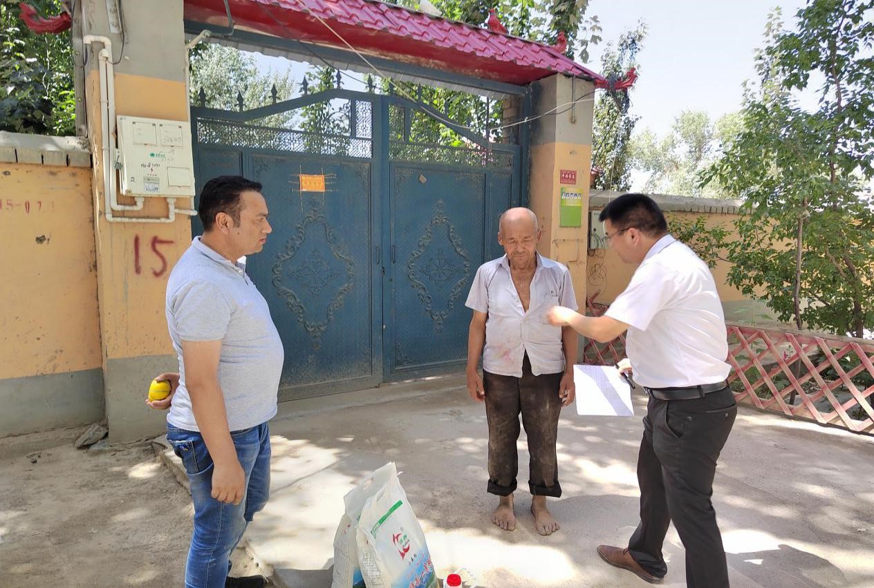 阿不來提·牙生老人遠遠看見工作隊后喜笑顏開,雙手接過劉書記手中的慰問品激動的說:“感謝黨,感謝工作隊一直以來對我的照顧?!卑⒉粊硖帷ぱ郎袀€殘疾的兒子,工作隊每逢重要節日都會走訪慰問,給其兒子申請了低保和殘疾補貼,并指導阿布來提·牙生搞種養殖業,這從很大程度上解決他們家的困難問題。