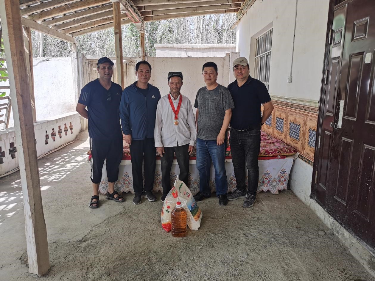 6月24日,新疆畜牧獸醫學會會員、新疆畜牧科學院駐色力布亞鎮拜什吐普(15)村工作隊隊長第一書記劉應進帶領“訪惠聚”工作隊員開展老黨員和貧困黨員走訪慰問活動。在這“七一”建黨節前夕,為老黨員和生活貧困的黨員送上了節日的問候,帶來了大米、面粉、食用油等生活用品,讓老黨員和困難黨員在生活上得到了幫扶、精神上得到了安慰,切身體會到了黨組織的關懷和溫暖,也拉近了駐村工作隊和村黨員的距離。