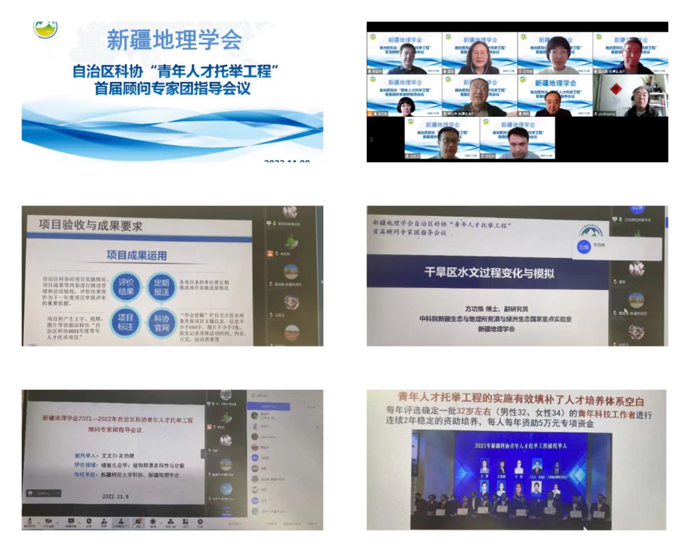 為更好發揮學會綜合優勢,促進青年人才成長,11月8日,新疆地理學會針對學會“2021-2022年度青年人才托舉項目”,召開顧問專家團線上指導會議,聽取青年人才項目進展匯報,7位與會專家給予全方位指導。
