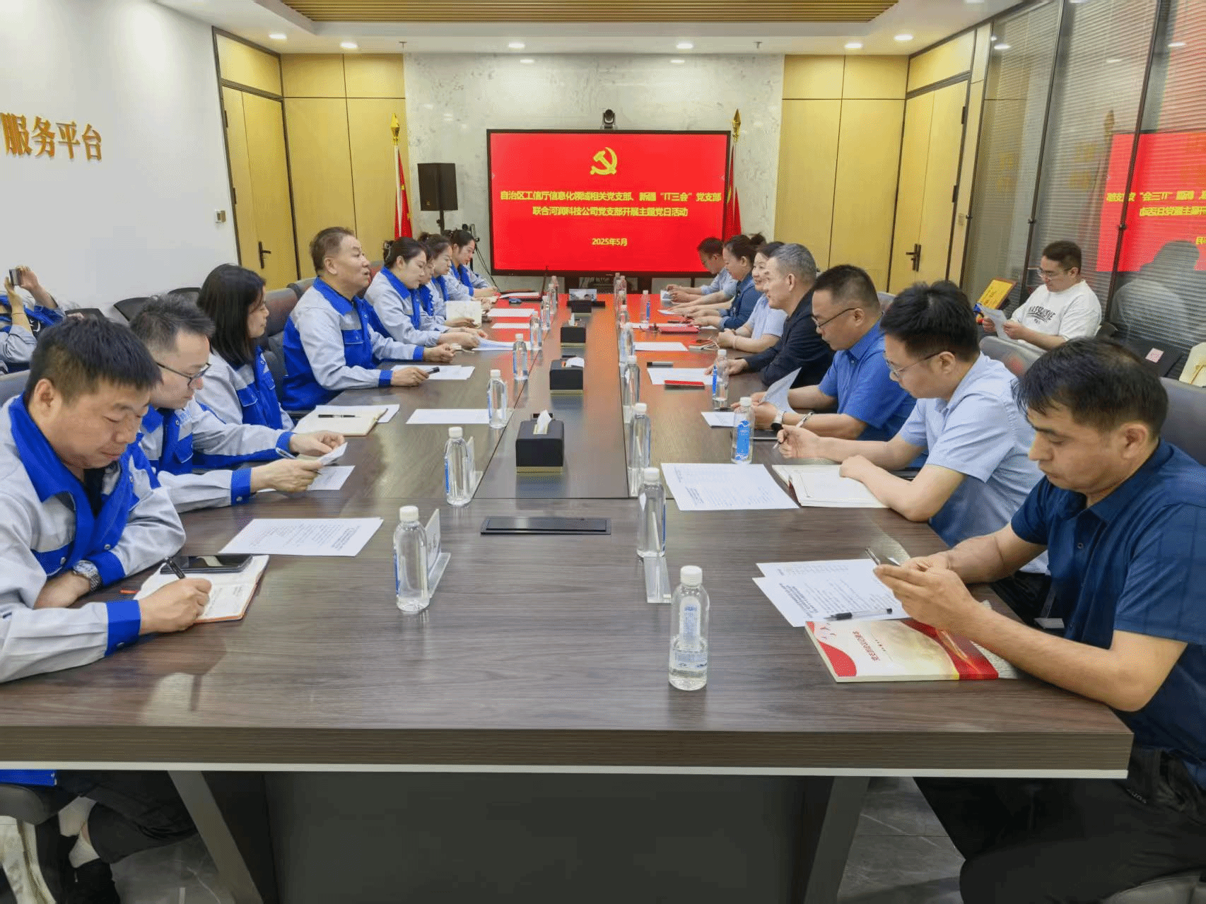 近日,自治區工信廳信息化領域相關處室黨支部、新疆“IT三會”黨支部與新疆河潤科技股份有限公司黨支部攜手開展“黨建共建聚合力 攜手同行促發展”主題黨日活動。三方共25名黨員代表及業務骨干齊聚一堂,通過實地參觀、集中學習、交流座談等多元形式,構建起互動合作平臺,推動資源共享與深度融合,共同繪就發展新藍圖。