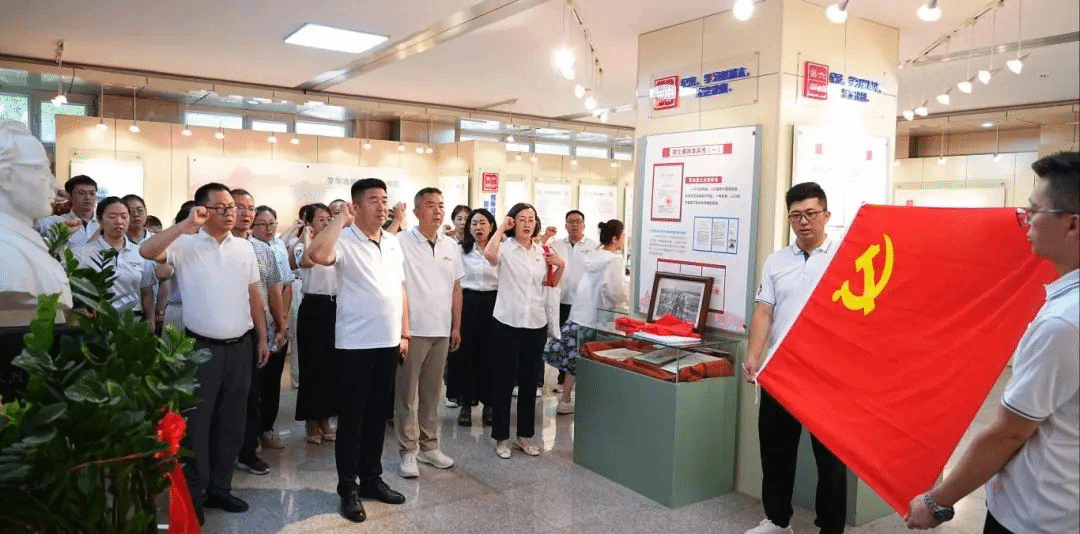 在科學家精神教育基地,全體黨員面向黨旗莊嚴站立,馬文新高工領誓,重溫入黨誓詞。鏗鏘有力的誓言響徹會場,再次喚醒黨員身份意識,激發為黨和國家事業奮斗的責任感與使命感。