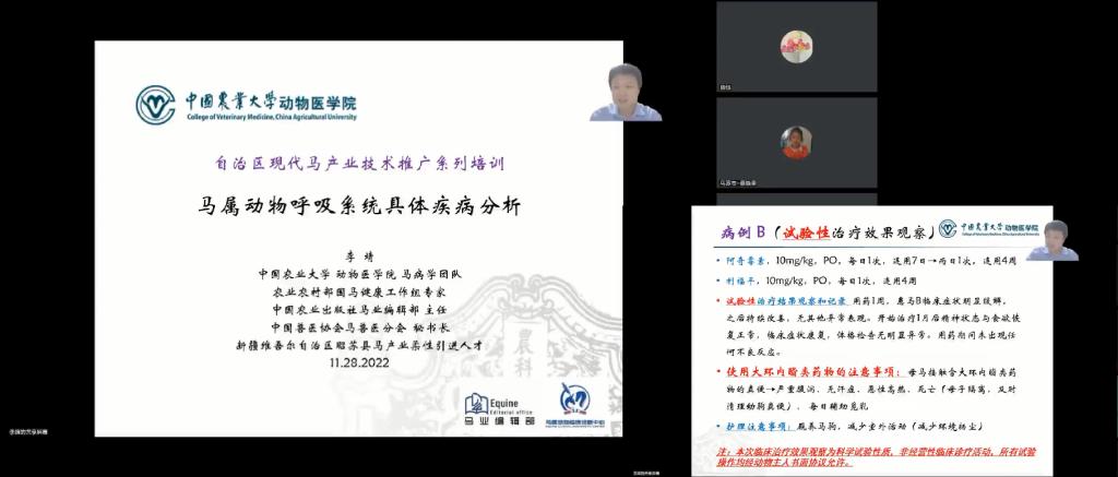 11月28日——馬屬動物呼吸系統(tǒng)具體疾病分析,由中國農(nóng)業(yè)大學(xué)李靖老師授課。通過向我們介紹四例臨床癥狀,清晰明了地講述幼駒、成年馬肺炎在生產(chǎn)實際中的診斷、治療和預(yù)防。