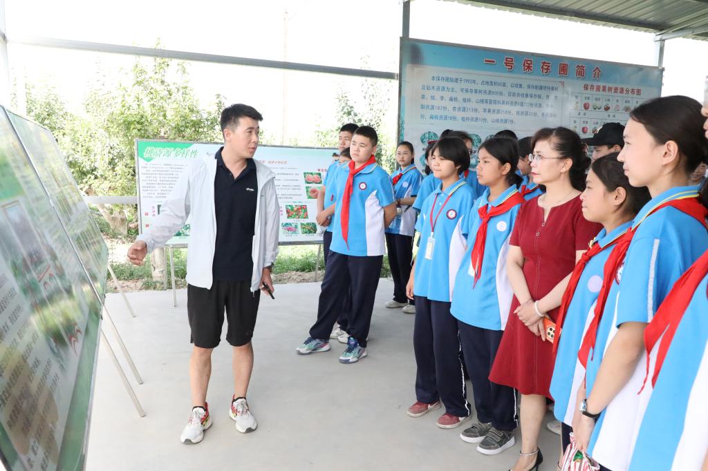 活動(dòng)中,輪臺(tái)果樹(shù)資源圃科技人員、新疆園藝學(xué)會(huì)專(zhuān)家結(jié)合展板向同學(xué)們介紹了果樹(shù)的分類(lèi),講解了果樹(shù)種質(zhì)資源的重要性和多樣性以及在培育果樹(shù)新品種過(guò)程中的艱辛歷程,使學(xué)生們對(duì)果樹(shù)種質(zhì)資源的保護(hù)和多樣性以及從事果樹(shù)相關(guān)研究的工作內(nèi)容等方面有了初步了解。隨后,講解人員帶領(lǐng)著輪臺(tái)縣第二中學(xué)的師生穿行于茂盛果林之中,與果樹(shù)近距離接觸,并結(jié)合果實(shí)具體形狀、大小、顏色等特點(diǎn),為同學(xué)們上了一堂生動(dòng)有趣的果林研學(xué)課,同學(xué)們?cè)诼?tīng)工作人員講解的同時(shí),采摘品嘗綠樹(shù)濃蔭下的果實(shí),在炎炎夏日中感受甜美的味道。