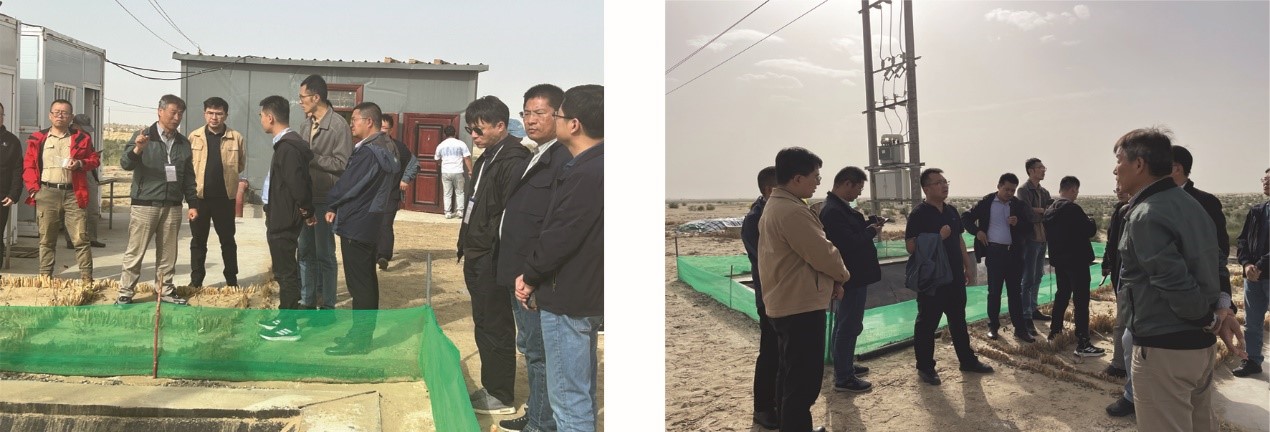 10月10日,參會(huì)人員針對(duì)塔克拉瑪干沙漠北緣阻擊戰(zhàn)沙雅模式進(jìn)行了實(shí)地勘察。在沙雅縣光伏咸水治沙現(xiàn)場(chǎng),沙雅縣林草局王開彥局長(zhǎng)向與會(huì)專家介紹了沙雅縣光伏+咸水的治沙模式已取得的成績(jī)和面臨的挑戰(zhàn),并向各位專家介紹了當(dāng)前和今后一個(gè)時(shí)期沙雅縣關(guān)于光伏+咸水戰(zhàn)略布局。勘察現(xiàn)場(chǎng),來(lái)自中國(guó)地質(zhì)調(diào)查局西安地質(zhì)調(diào)查中心的張俊研究員專門針對(duì)沙漠北緣的水循環(huán)過(guò)程、咸水補(bǔ)給方式和時(shí)空演變規(guī)律與各位專家進(jìn)行了交流與討論。雷加強(qiáng)研究員專門針對(duì)沙雅縣光伏+咸水的典型模式進(jìn)行了解讀,認(rèn)為這種模式具有低成本、高效率和靈活性強(qiáng)的特征,一旦大面積推廣應(yīng)用,將成為解決塔克拉瑪干沙漠邊緣阻擊戰(zhàn)生態(tài)用水缺口的有效途徑。此外,來(lái)自企業(yè)的專家針對(duì)光伏+咸水裝置的成本問(wèn)題進(jìn)行了討論。