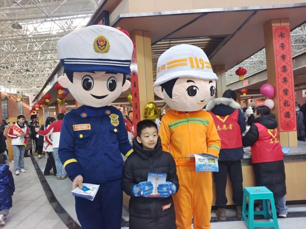 同時,現場還組織了一支消防卡通人偶小分隊,消防宣傳人員穿著卡通人偶服向趕年集的群眾發放消防宣傳單及宣傳品,以生動有趣的方式向群眾傳遞消防安全信息,極具親和力的消防卡通人偶,很好地拉近了消防員與群眾的距離,群眾紛紛上前合影互動,咨詢相關消防安全知識,營造了濃厚的消防宣傳氛圍。