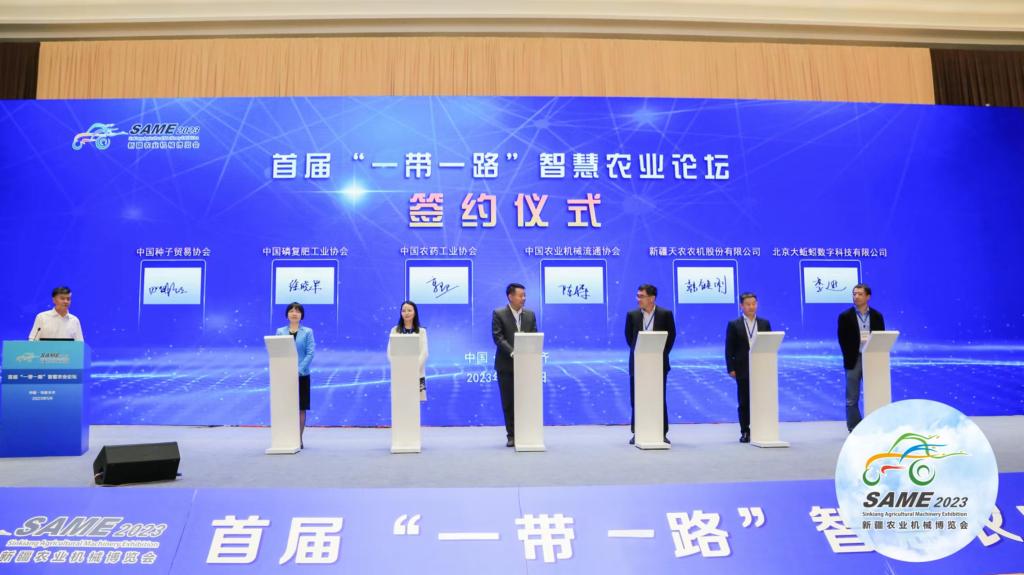 論壇開幕式上,中國農業機械流通協會、中國農藥工業協會、中國磷復肥工業協會、中國種子貿易協會與北京大蚯蚓數字科技有限公司和新疆天農農機股份有限公司簽署智慧農業合作協議。