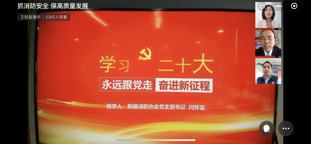 活動伊始,新疆消防協會黨支部書記、秘書長閆懷宣領學了黨的二十大精神,重點解讀了《推進國家安全體系和能力現代化,堅決維護國家安全和社會穩定》等部分內容,傳達學習了自治區安委會《關于做好2022年消防宣傳月活動相關工作的通知》精神,并對如何開展好“119”消防宣傳月活動提出了合理化建議,以線上互動的形式進行業務指導。