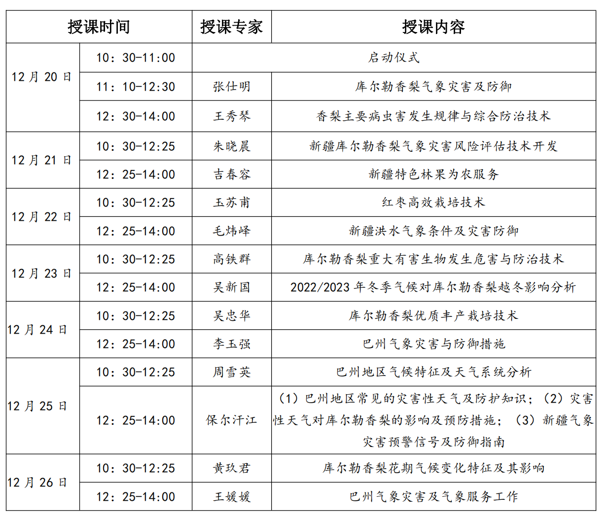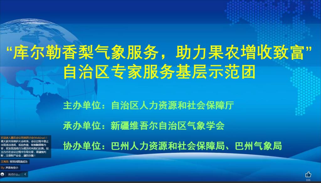 20日—26日為期一周的“專題講座”通過騰訊會議形式在線開展,由來自南京信息工程大學、新疆農業大學、巴州農業局、巴州農科院、新疆生產建設兵團第二師二十九團農業發展中心及氣象部門的14位專家、教授組成的專家團做專題講座,針對庫爾勒災害性天氣防御、香梨氣象服務、林果病蟲害與防治、香梨栽培技術等內容開展技術交流、研討。參會學員主要來自巴州庫爾勒香梨主產區250余人。