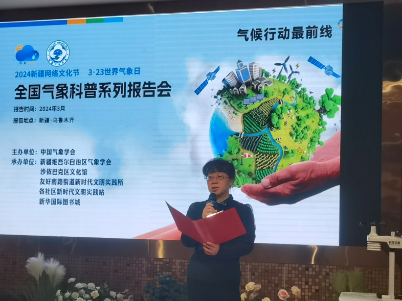 新疆氣象學會正高級工程師王鳳梅簡述了世界氣象日的由來及此次活動的目的、意義。為社區居民播放了世界氣象日科普宣傳片,呼吁全社會行動起來,在減緩和適應氣候變化領域進行更加有效的合作,積極應對全球變暖給人類生存和發展帶來的嚴峻挑戰。