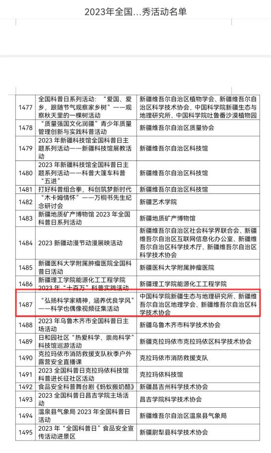 喜報?。?!新疆地理學會舉辦的“弘揚科學家精神,涵養優良學風”---科學也偶像視頻征集活動”榮獲全國科普日優秀活動
