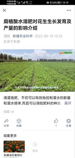 短視頻數字化出版利用原文進行內容進行數字編輯加工,通過網絡傳播數字期刊內容,方便公眾閱讀。《新疆農業科學》編輯部通過與作者和微信公眾號協作,將2022年6、7兩期刊登論文“油藥兼用紅花種質資源生長發育及光合特性分析”“腐殖酸水溶性肥對花生生長發育及產量的影響”(作者單位均為新疆農業科學院經濟作物研究所)制作成1-2分鐘短視頻,在《新疆農業科學》微信公眾號視頻欄目于2022-7-6和2022-8-18發布,受到作者讀者好評。