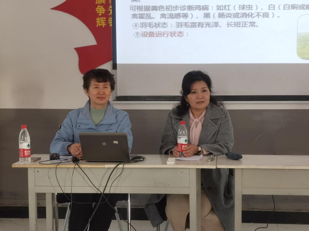 自治區家禽產業技術體系首席專家,新疆家禽專業委員會主任,新疆農業大學動物科學學院李海英教授(左)為養雞農戶們講解家禽養殖關鍵技術以及病害害預防措施。