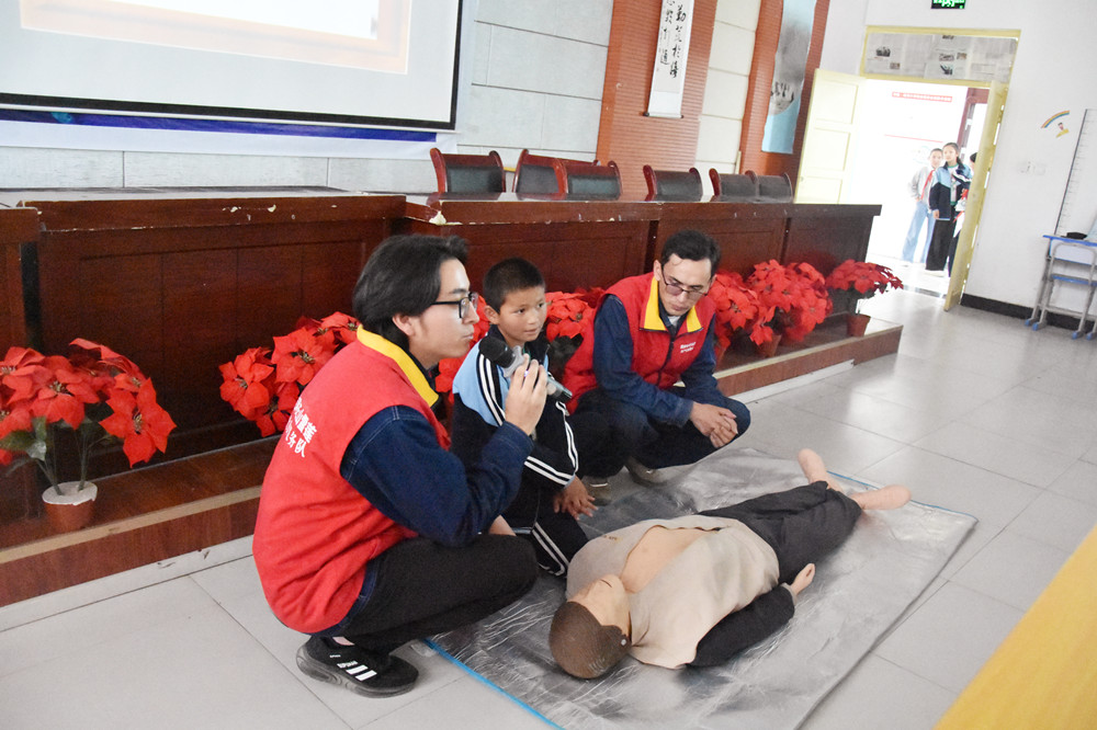 8月31日,國網克州公司的電力科技工作者在阿合奇縣托河小學講解觸電急救案例,指導小學生學習心肺復蘇等搶救措施。