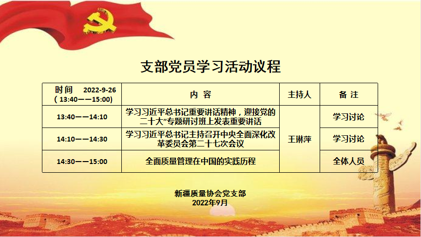 最后,新疆質量協(xié)會黨支部書記王琳萍再次強調,全體黨員要認真學習領會習近平總書記重要講話精神,把思想和行動統(tǒng)一到黨中央決策部署上來,立足崗位、真抓實干、強化學習,不斷提升個人政治素養(yǎng)和專業(yè)技術水平,深入推廣先進質量管理方法,貫徹高質量發(fā)展理念,踔厲奮發(fā)、勇毅前行,以實際行動迎接黨的二十大勝利召開,為新疆經(jīng)濟社會發(fā)展貢獻一份寶貴力量。
