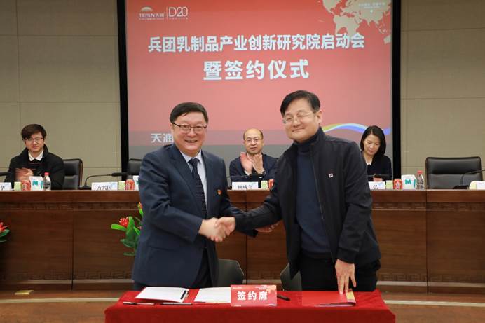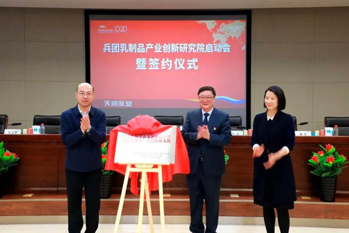 為了加快我區(qū)乳制品產(chǎn)業(yè)鏈建設(shè),加強(qiáng)兵團(tuán)乳制品行業(yè)科技創(chuàng)新,推動相關(guān)乳企高質(zhì)量發(fā)展,2月23日,兵團(tuán)乳制品產(chǎn)業(yè)創(chuàng)新研究院在新疆微生物學(xué)會理事單位——天潤乳業(yè)股份有限公司正式揭牌成立。研究院依托天潤生物科技有限公司,與石河子大學(xué)、新疆大學(xué)、中國農(nóng)業(yè)科學(xué)院、北京中醫(yī)藥大學(xué)等單位攜手共建。兵團(tuán)工業(yè)和信息化局黨組成員、副局長顧成奎,兵團(tuán)科技局黨組成員、副局長李弘出席揭牌儀式。中國工程院院士任發(fā)政、農(nóng)業(yè)農(nóng)村部食物與營養(yǎng)發(fā)展研究所所長王加啟、國際食品科學(xué)院院士王強(qiáng)線上參會。新疆微生物學(xué)會理事、石河子大學(xué)食品學(xué)院倪永清教授作為特邀專家參與研究院啟動會簽約儀式,并與天潤乳業(yè)黨委書記、董事長劉讓簽署了研究院共建協(xié)議。