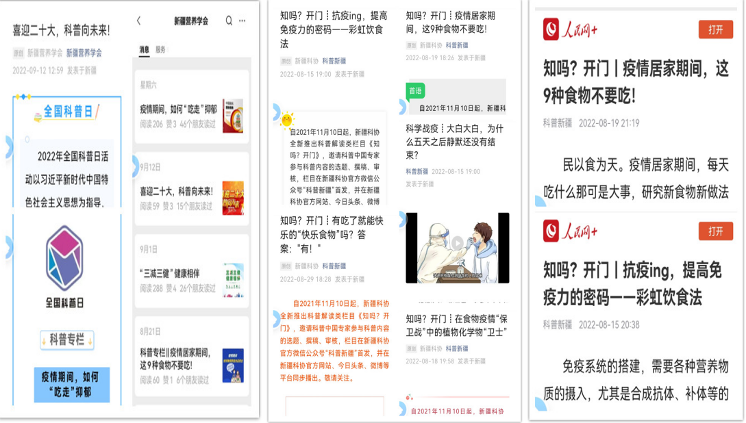 多角度加大對全國科普日活動的宣傳力度。新疆營養學會通過公眾平臺宣傳2022年全國科普日活動主題、主題宣傳片和營養科普知識,圍繞主題開展科普文章、科普短視頻征集活動。先后在科普新疆平臺發布科普視頻1個、原創科普文章4篇,其中人民網轉載原創科普文章2篇。學會公眾平臺發布科普專欄4篇,其中科普新疆轉載原創科普文章1篇。