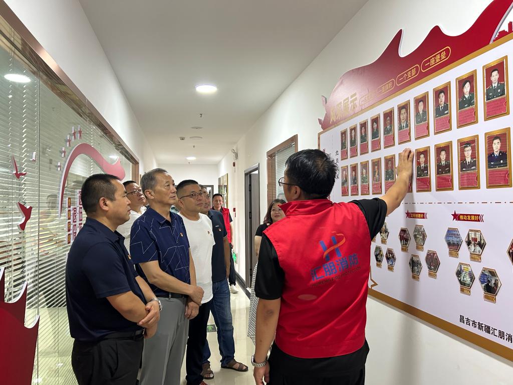 為慶祝中國人民解放軍建軍96周年,在“八一”建軍節即將到來之際,7月25日,新疆消防協會結合正在開展的學習貫徹習近平新時代中國特色社會主義思想主題教育和“大走訪、大調研、大服務“活動,組織黨員會員深入昌吉,先后走訪了會員企業新疆新宸環保科技服務有限公司、新疆匯朋消防工程有限公司,參觀了昌吉市退役軍人就業創業園,并在新疆匯朋消防工程有限公司組織了“消防老兵”慶“八一”建軍節主題黨日活動。新疆消防協會會長張照雄、秘書長閆懷宣及會員單位代表鄧勇剛、左明輝、唐培鑫、武恩來、周振江、程艷、牛江峰、曾志平等齊聚一堂,共慶建軍佳節。