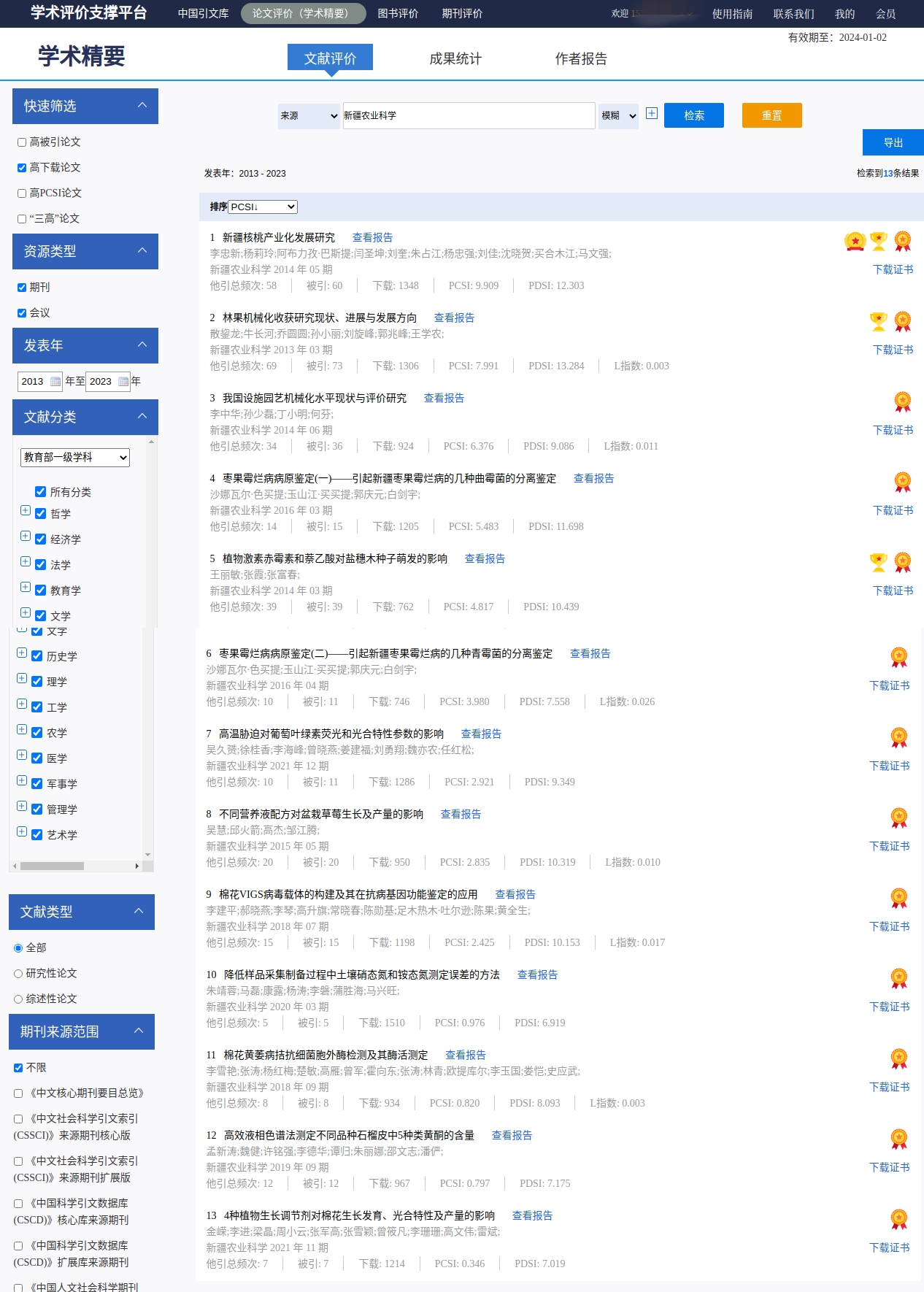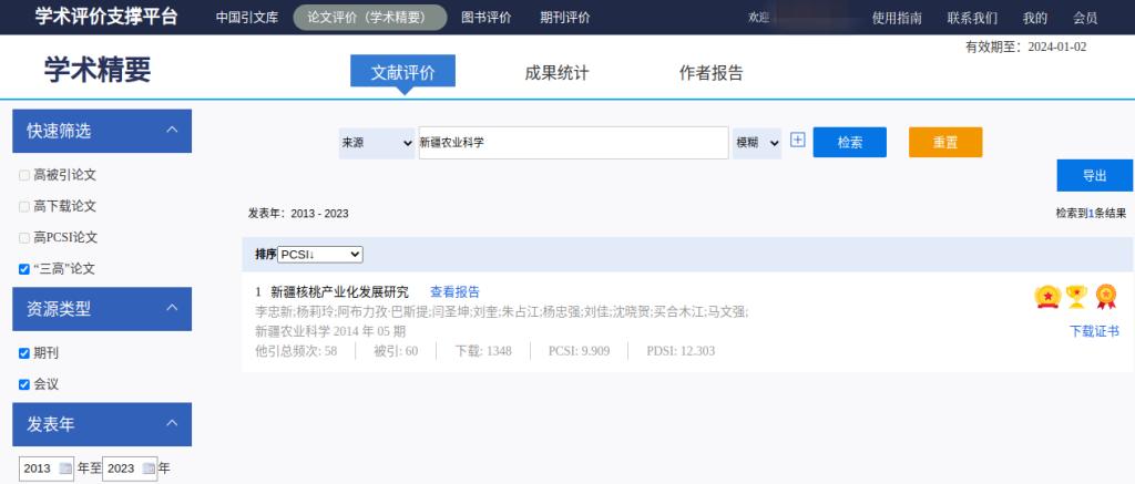 據(jù)中國知網(wǎng)《學(xué)術(shù)精要數(shù)據(jù)庫》(https://xsjy.cnki.net/)2023年11-12月最新發(fā)布的各學(xué)科高影響力論文顯示,《新疆農(nóng)業(yè)科學(xué)》2013-2023年間發(fā)表的文章中共有658篇論文入選。其中,高PCSI(論文引證標(biāo)準(zhǔn)化指數(shù))論文16篇(PCSI指數(shù)排名前1%的論文),高被引論文24篇(他引總頻次排名前1%的論文),高下載論文13篇(總下載頻次排名前1%的論文);同時(shí)為高PCSI論文、高被引論文和高下載論文的“三高”論文1篇。