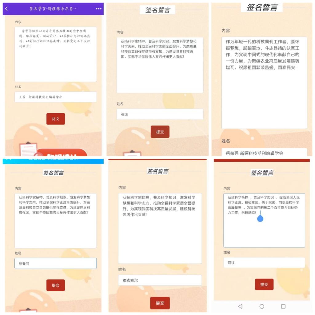 為充分體現全區上下對黨的二十大勝利召開的深切期盼和喜悅情感,展示全區科技工作者共迎盛會的良好精神風貌,10月16日,自治區科協面向全區廣大科技工作者開展“科普向未來 喜迎二十大”網上簽名留言活動。新疆科技期刊編輯學會立即組織廣大會員積極參加。“弘揚科學家精神,普及科學知識,激發科學夢想和科學志向,推動全民科學素質全面提升,為高質量科技自立自強提供堅強支撐,為建設世界科技強國,為實現中華民族偉大復興作出更大的貢獻!”“作為一名青年科技工作者,要胸懷祖國,放眼世界,主動承擔起該有的責任,腳踏實地,奮發有為,緊跟時代步伐,不斷學習,不斷創新”......一個個寄語真摯誠懇。