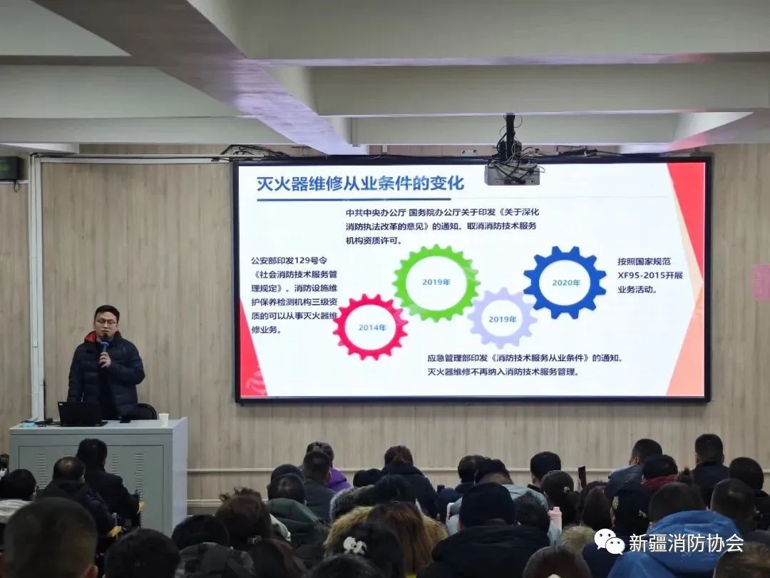 為進一步提高我區滅火器維修人員業務素質和業務能力,增強從業人員的法律法規意識,規范滅火器維修行業市場行為,2023年12月11日-14日,新疆消防協會舉辦了2023年度滅火器維修企業從業人員業務能力提升培訓班。協會專家庫成員、高級工程師李守斌和協會理事、資深專家蔡軍鳳作為主講嘉賓進行專題培訓。來自全區滅火器維修企業200余名從業人員參加了第一期培訓班。