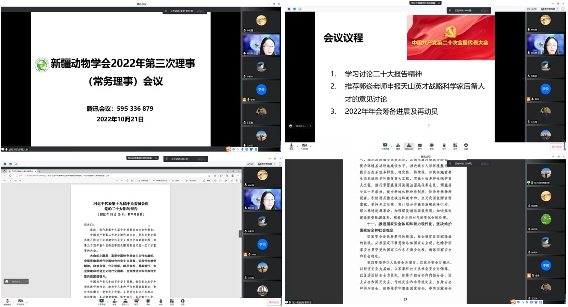 為深入學習宣傳貫徹黨的二十大精神,用黨的二十大精神鼓舞推動新疆動物學會的各項工作。新疆動物學會于2022年10月21日召開學會理事會線上會議,會議由秘書長胡紅英主持,理事長楊維康以及時磊、李俊、汪沐陽等理事參加了會議。