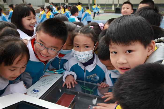 移動科普館的12個展項通過視頻、文字、聲音和小游戲的形式展示了新疆地震背景、烏恰因震害遷城的模型、泥火山、地震預警原理模型、新疆安全農居模型等。還有10個互動展板,采用手搖發電的形式,手搖就可以激發語音講解和動態展示,介紹一些地震基本知識,互動性很好,深受同學們的喜愛。同學們紛紛在科普宣傳員的指導下進行操作,看視頻、聽語音講解和玩小游戲,在歡笑聲中學習防災減災知識。