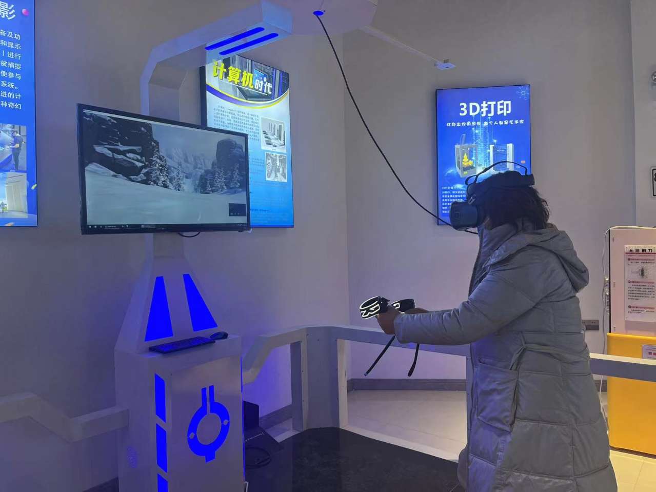 隨著北京冬奧會的舉行,位于未來之約展廳的VR體驗區滑雪項目成為館內最大的亮點。大家頭戴VR眼鏡,沉浸在VR滑雪比賽中,或轉彎,或跳躍,或躲避障礙物,爭先體驗,不亦樂乎。