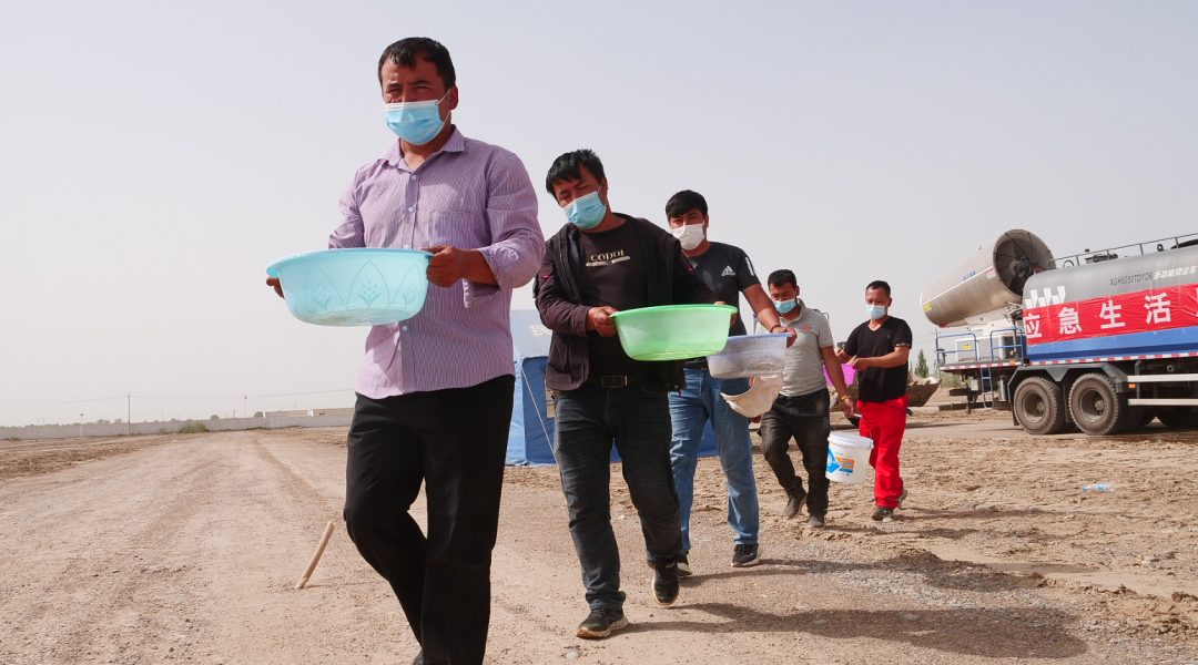 隨著地震警報拉響,演練正式開始,各演練小組在演練指揮長的指揮下開始搶險救災(zāi)各項工作。演練現(xiàn)場,干部群眾紛紛頭頂臉盆、毯子等防護物品向應(yīng)急避難場所緊急疏散,蓋孜庫木鄉(xiāng)向指揮部匯報災(zāi)情,并組織干部群眾展開自救。