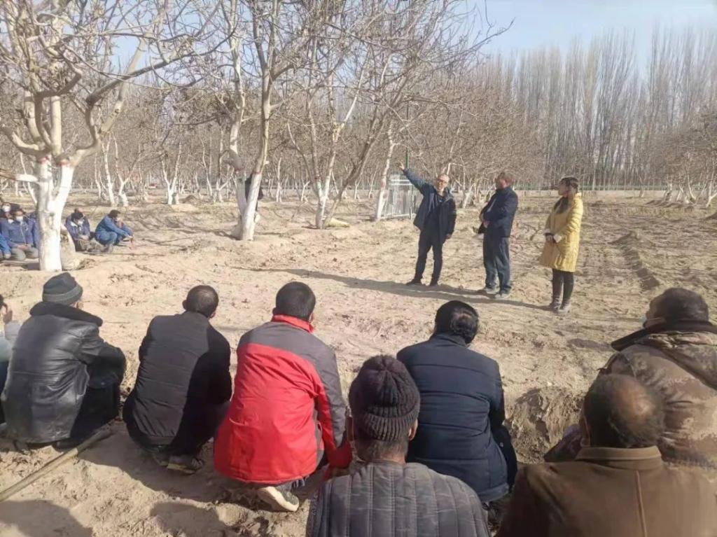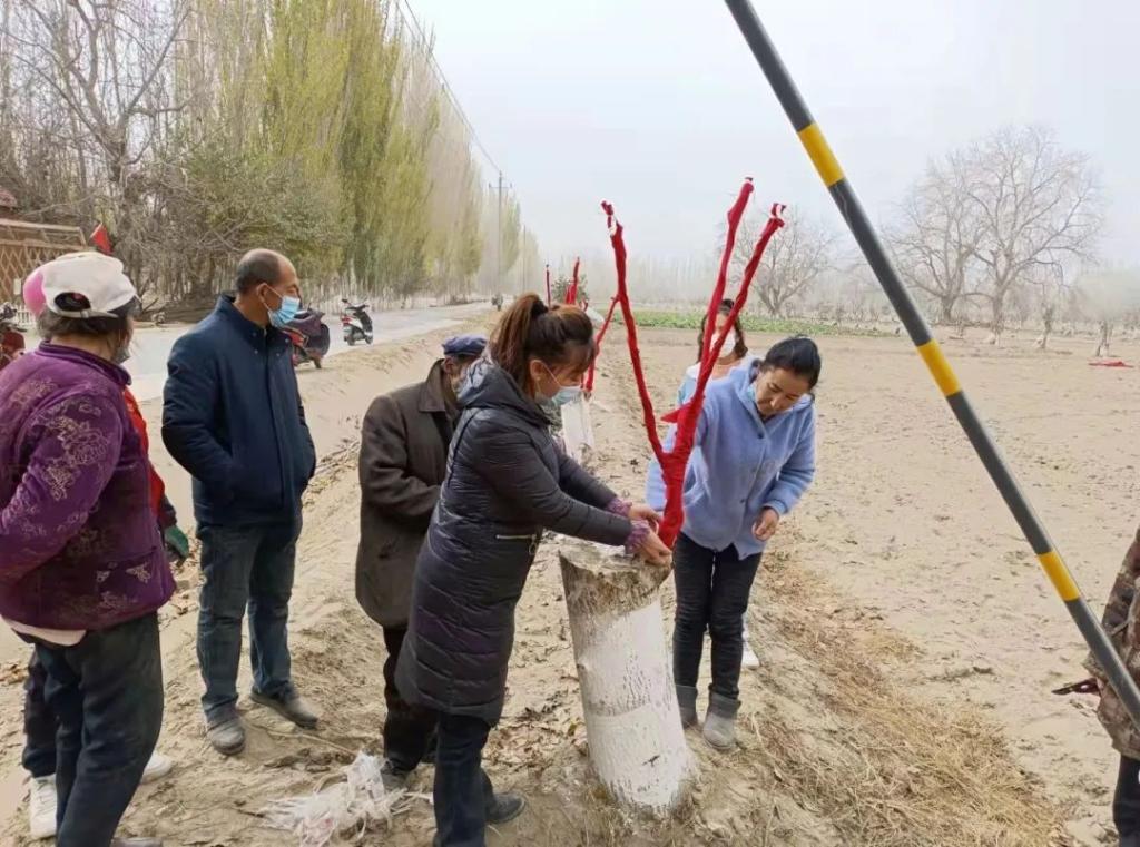 在阿拉薩依汗(10)村,林果業技術員正在向村民們講解、傳授核桃嫁接技術,并結合本鄉土質、雨水等實際條件,傳授科學鋸樹、選條、削口、嵌穗、包扎等技術要領。大家干勁十足,抓住當下春季管理的最佳時期,努力打造穩定增收致富特色產業。
