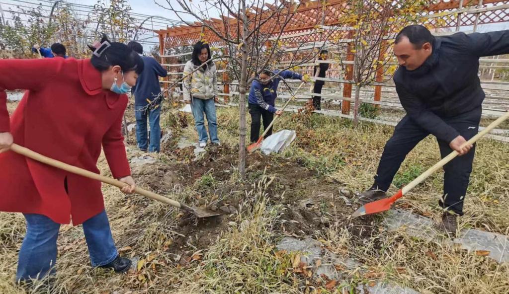 來到克孜勒希力克鄉(xiāng),鄉(xiāng)政府早已組織好包村干部們。在技術專家的示范下,村干部們一起學習如何給蘋果、李子、海棠施肥,挖施肥溝的寬度、深度及施肥量、墊土厚度等以及葡萄的修剪方法、施肥和埋土、澆冬灌水等措施。