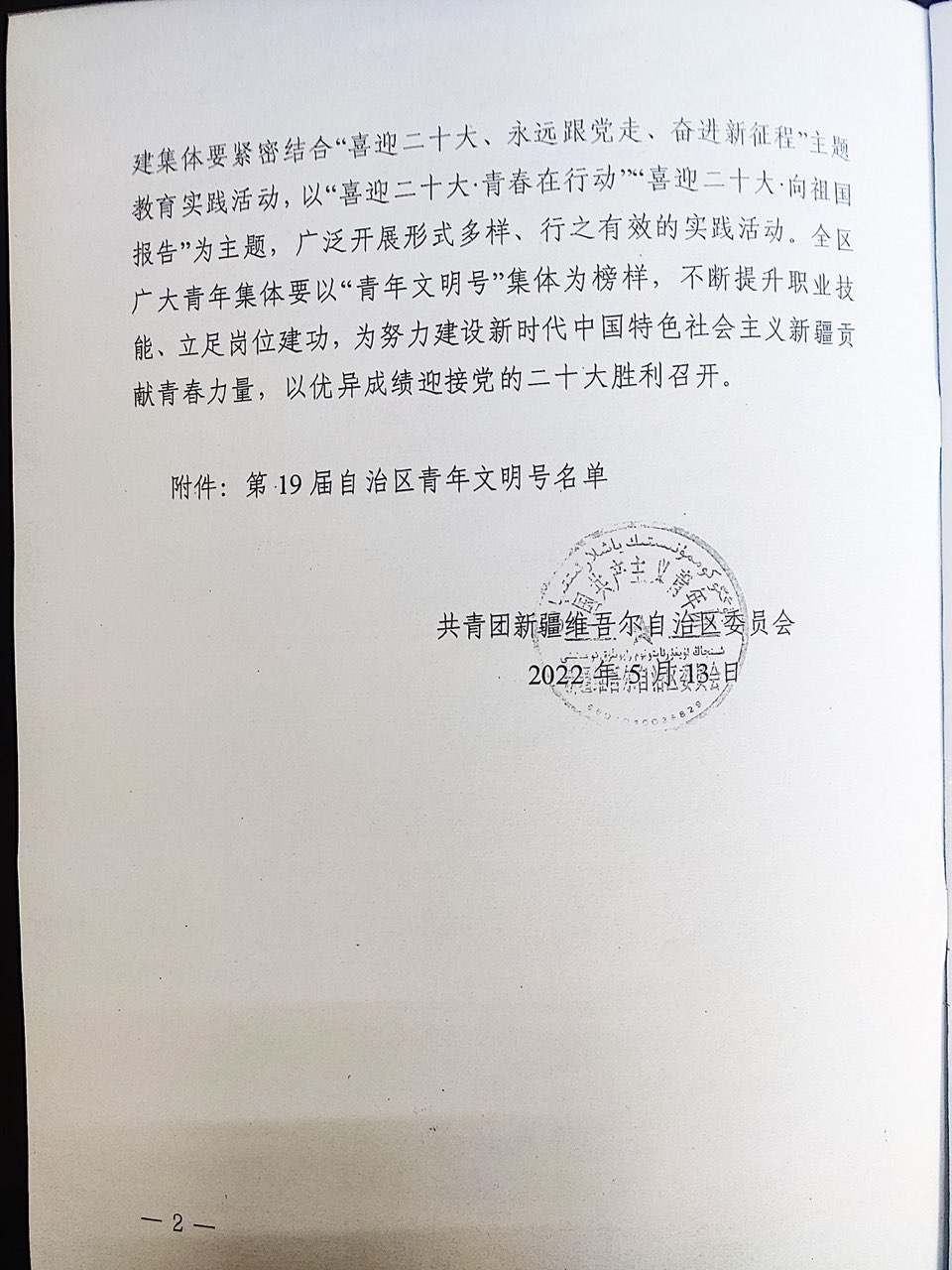 根據共青團新疆維吾爾自治區委員會《關于命名第19屆自治區青年文明號的決定》(新團發【2022】 2號),新疆科技館展覽中心榮獲“第19屆自治區青年文明號”榮譽稱號。