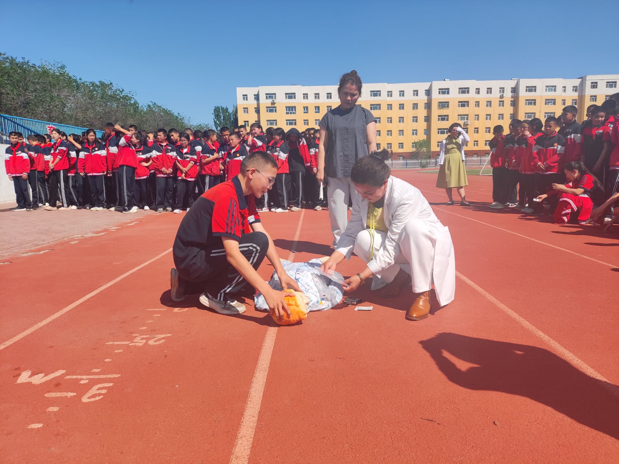 活動(dòng)現(xiàn)場(chǎng),額敏縣紅十字會(huì)應(yīng)急救護(hù)培訓(xùn)師通過(guò)模擬真實(shí)場(chǎng)景,用通俗易懂的語(yǔ)言和逼真的模擬道具,為學(xué)校2000余名師生講解了心肺復(fù)蘇、海姆立克急救等急救操作。為了增強(qiáng)學(xué)生們的體驗(yàn)感,應(yīng)急救護(hù)培訓(xùn)師現(xiàn)場(chǎng)進(jìn)行示范,并邀請(qǐng)學(xué)生們上臺(tái)實(shí)踐操作,使學(xué)生們更好地掌握了急救知識(shí)和技能。