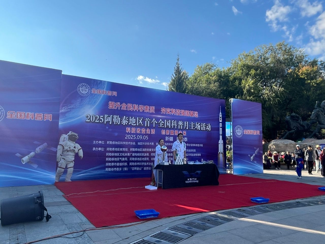 9月5日,克拉瑪依科技館受邀赴阿勒泰地區(qū),在阿勒泰地區(qū)全國(guó)科普月主場(chǎng)活動(dòng)開(kāi)幕式上精彩亮相,以?xún)蓤?chǎng)沉浸式科學(xué)表演點(diǎn)燃當(dāng)?shù)厝罕姷目茖W(xué)熱情。