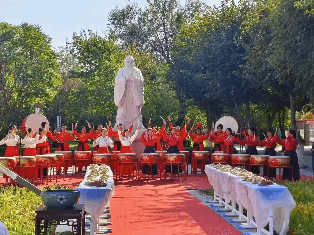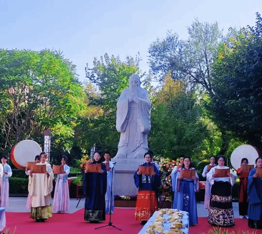 在昌吉市第一中學的孔子誕辰紀念活動中,鼓舞表演以《象王行》為律,通過節奏與隊形的變化呈現“門扉開啟”的視覺意象,隱喻“知識之門”的打開。主祭官及師生代表行凈手、整衣、獻花之禮,以莊重儀式傳遞對先賢的敬意,同時也體現了行為心理學中“儀式感”對集體認同的強化作用。誦讀《論語》《大學》等經典篇章,不僅展現語言韻律之美,更暗合認知科學中“韻律記憶”對知識長期留存的有效性。