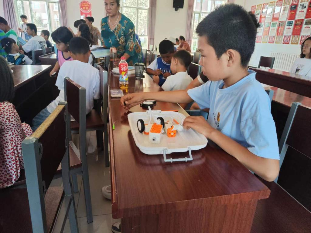 活動邀請輔導老師進行小白機器人、機甲大師等科技展品表演,激發(fā)孩子們的興趣,隨后為孩子們深入淺出地上了一堂機器人科學課。孩子們在現場用編程機器人拼接套裝在老師的指導下拼出一臺臺“小車”,親身體驗科技的魅力。最后,科技工作者為孩子們發(fā)放了飛機模型、學習用品和科普宣傳資料。