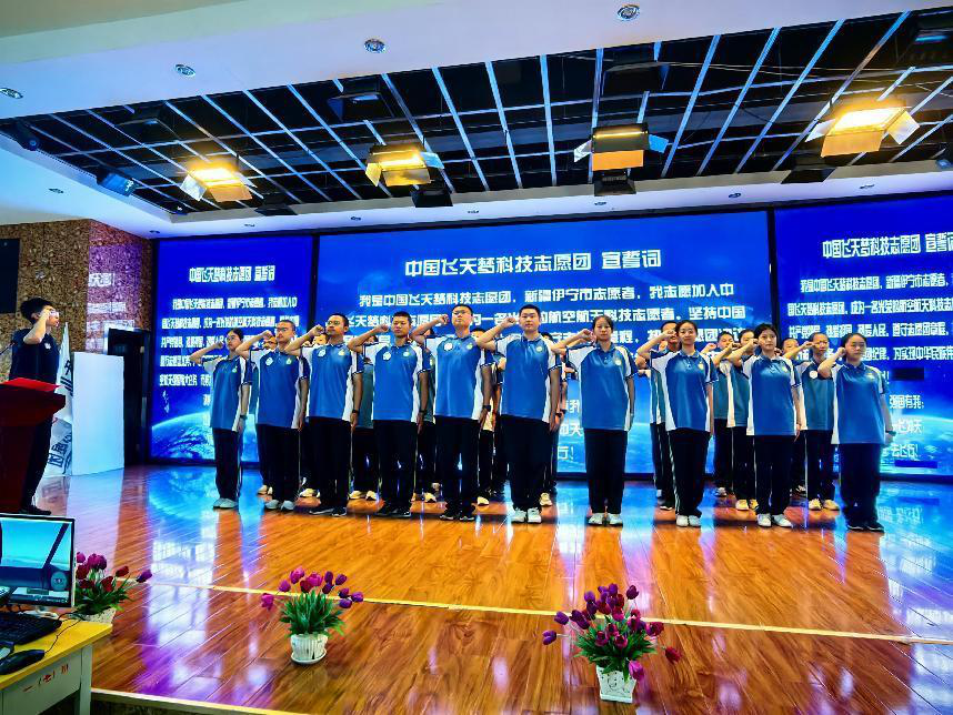 活動(dòng)中,中國(guó)飛天夢(mèng)科技志愿團(tuán)向伊寧市支隊(duì)授旗,30名志愿者代表上臺(tái)宣誓,加入中國(guó)飛天夢(mèng)科技志愿團(tuán)。