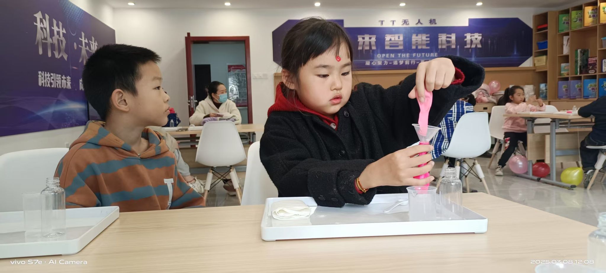 在科學小實驗環節,孩子們看到白醋與小蘇打產生的化學反應后,臉上洋溢著驚喜與好奇。