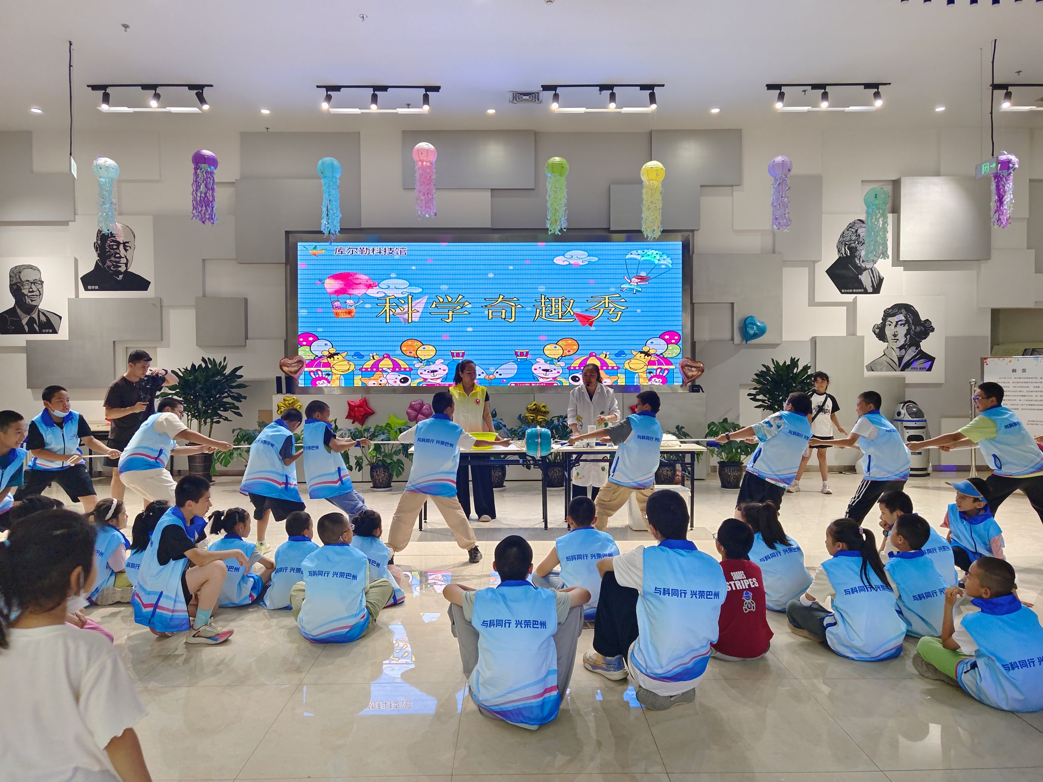 科技館狂歡,科學秀引爆“最強大腦”。庫爾勒科技館將此次培訓活動推向高潮。《消失的水》《馬德堡半球》等科普秀通過趣味實驗揭秘大氣壓強、電流等原理,營員們分組挑戰“拔球實驗”、體驗“千人震”,在笑聲與驚嘆中點燃科學熱情。