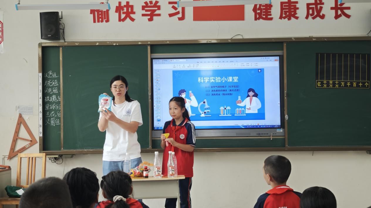 隨后的科學小實驗環節,成為現場最受學生歡迎的“重頭戲”。志愿者們圍繞三個趣味實驗展開演示與互動:在“會吹氣球的瓶子”實驗中,學生們直觀觀察到化學反應產生的氣體如何讓氣球“自動膨脹”;在“消失顏色的碘伏”實驗里,當無色液體滴入碘伏后顏色逐漸褪去,孩子們紛紛發出驚嘆;“消失的水”實驗則通過特殊材料的吸水性,讓學生們對物質特性有了全新認知。實驗過程中,志愿者一邊操作一邊講解科學原理,還邀請學生上臺動手參與,充分激發了大家的探索欲與求知欲。