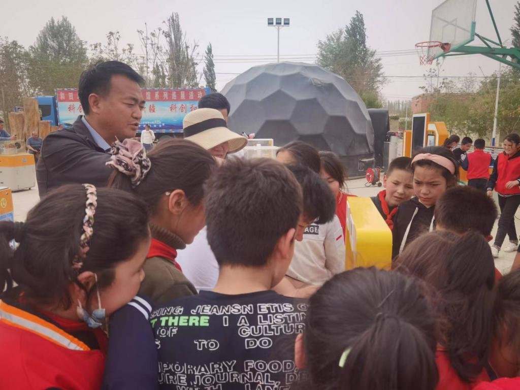 為了全面推進全民科學素質(zhì)提升行動“十四五”中期評估工作,全面提升我市“五大人群”全民科學素質(zhì)提升,將科學知識送到最偏遠的鄉(xiāng)村,4月11日-4月13日,和田地區(qū)科協(xié)、和田市科協(xié)聯(lián)合,將“流動科技館”大車,駛?cè)刖嚯x和田市最遠的鄉(xiāng),擁有魅力絲綢之鄉(xiāng)的吉亞,開展“流動科技館巡展”活動。生動的3D恐龍、神秘的球幕影院、聲光電學的科普教具、可愛的機器人表演、驚心動魄的無人機表演。成為了本次巡展的最熱門,吸引了無數(shù)參加巡展的農(nóng)牧民、鄉(xiāng)村青少年、機關(guān)干部的眼球,巡展期間隨處都會響起陣陣掌聲和尖叫聲,讓大家近距離的感受科技的神奇奧秘和科學的魅力。極大地鼓舞參觀者崇尚科學、熱愛科學、學習科學、使用科學來創(chuàng)造我們的美好生活的信心和決心。