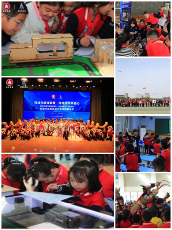 精彩的無(wú)人機(jī)編隊(duì)表演正式拉開(kāi)科技節(jié)的帷幕。本屆科技節(jié)活動(dòng)精彩紛呈、形式多樣,內(nèi)容豐富有趣、科技感強(qiáng),分為上午科技節(jié)開(kāi)幕式表演及科技互動(dòng)體驗(yàn)項(xiàng)目和下午進(jìn)班級(jí)科普活動(dòng)及科普講座兩部分進(jìn)行。開(kāi)幕式還展示了科技老師們帶來(lái)的科學(xué)秀表演《穿越之奇幻科技節(jié)》、海淀學(xué)生的經(jīng)典誦讀《中國(guó)傳統(tǒng)節(jié)日》。科技互動(dòng)體驗(yàn)項(xiàng)目包含海淀小學(xué)科技社團(tuán)的學(xué)生科技創(chuàng)作區(qū)及科技節(jié)機(jī)器人互動(dòng)體驗(yàn)區(qū):足球機(jī)器人對(duì)抗、無(wú)人駕駛機(jī)器人、動(dòng)感小車表演;科技創(chuàng)新體驗(yàn)區(qū):激光雕刻機(jī)、金屬機(jī)器人DIY、車輛駕駛體驗(yàn)、無(wú)土栽培柜等展示;航空航天科技展區(qū)車模遙控表演;人工智能展區(qū):智能機(jī)械臂;元宇宙展區(qū):VR虛擬場(chǎng)景愛(ài)國(guó)主義教育、VR體感射擊體驗(yàn)天宮空間站、航天AI感知交互體驗(yàn)。異彩繽紛的科技體驗(yàn)項(xiàng)目,科技感滿滿的科技儀器,創(chuàng)新有趣的科技作品,極具美感的美猴王、黑熊的科技舞蹈。給孩子們帶來(lái)了一場(chǎng)饕餮盛宴,讓好奇與童真、智慧與科技碰撞出絢麗的火花。